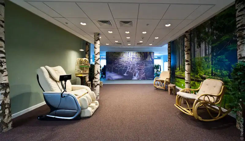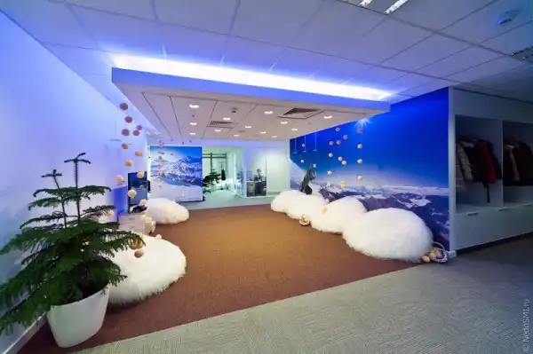 В офисе есть несколько типов рабочих мест: опенспейс, где все находятся вместе, помещения на одного человека, для желающих работать в одиночестве, переговорки на 4, 8, 10 человек и десять тематических зон отдыха «Россия», «1950-е», «Париж», «Природа», «Горы», «Океан», «Нидерланды», «Нью-Йорк», «Рим» и «Авангард»