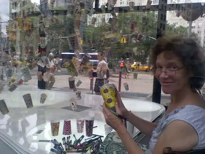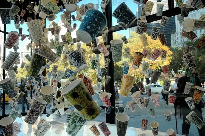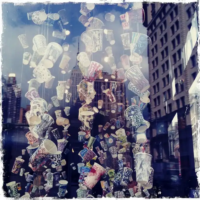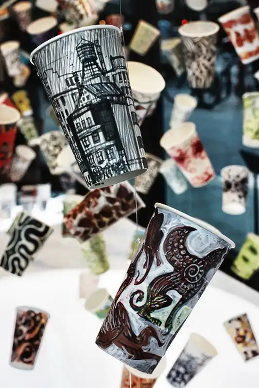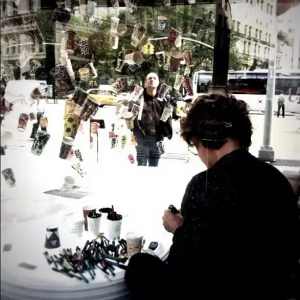 После того, как вы выпиваете кофе, что вы делаете со своим бумажным стаканчиком? Хотя большинство из нас бросает чашку в мусорное ведро, художница Гвинет Лич ( Gwyneth Leech) создала инновационную инсталляцию. Лич, которая живет и работает в Нью-Йорке, после опустошения каждой чашки, отмечает дату, местоположение и тип напитка, который был выпит. Это - ее способ запечатлеть социальный момент, как многие сегодня делают это через социальные сети, такие как Twitter, Facebook, Google +, и Flickr.