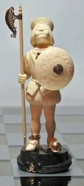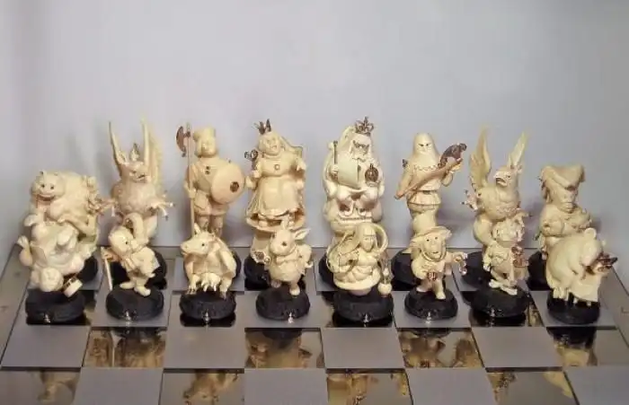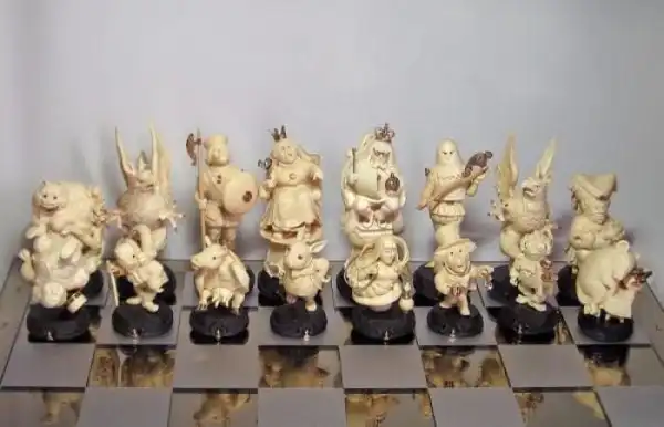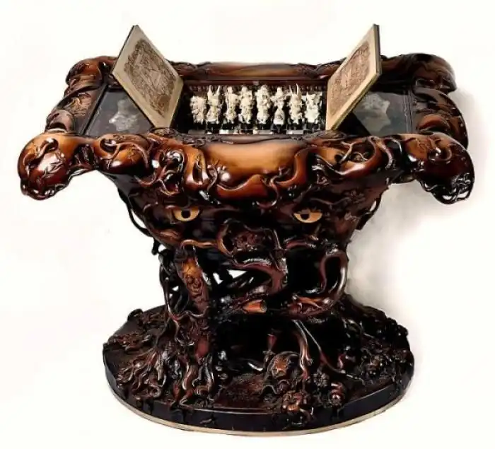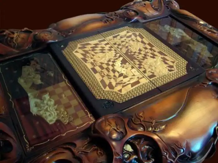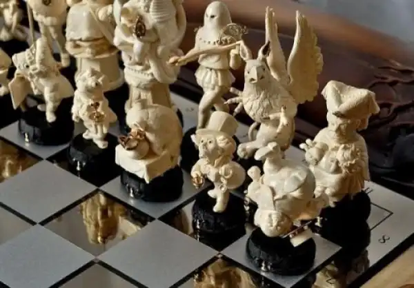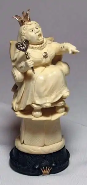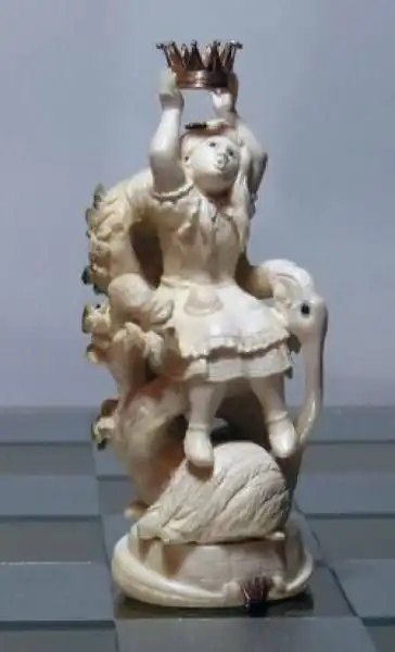Украинские мастера Иосиф Эпштейн (автор проекта), Александр Коняев (скульптор), Святослав Коштелянчук (ювелир-художник) и Владимир Русинов (резьба по дереву) сделали шахматы, которые поражают воображение. Прототипами для фигур послужили персонажи из книги Льюиса Кэрролла «Алиса в стране чудес”, но мастера не ограничились лишь фигурками и шахматным столом, а частично воссоздали Мир Зазеркалья.