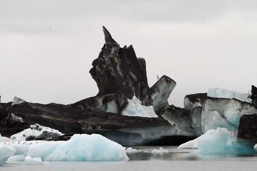 Айсберги, усыпанные пеплом вулкана Гримсвотн, в лагуне айсбергов у основания ледника Ватнайёкюдль, Исландия.