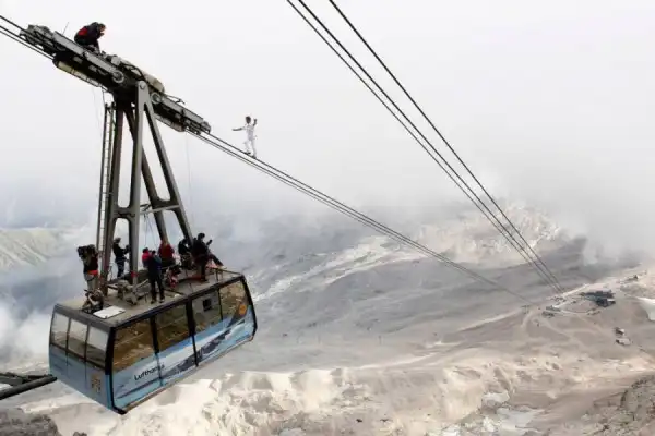 Швейцарец Фредди Нок балансирует на тросе канатной дороги, которая ведет на самую высокую гору Германии, Цугшпитце (2962 м), недалеко от курорта «Гармиш-Партенкирхен» на юге Баварии, 20 августа 2011 года. Нок прошел по 995-метровому тросу, чтобы побить мировой рекорд, ранее установленный им же.