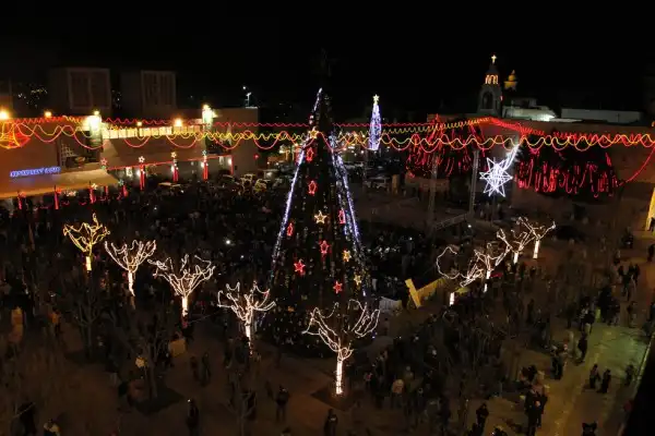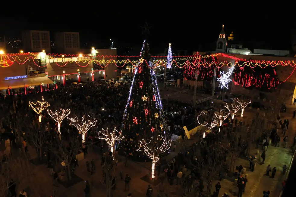 20. Палестинцы смотрят церемонию зажжения рождественской елки на Ясельной площади, у Базилики Рождества Христова в Вифлееме. (AP / Nasser Shiyoukhi)
