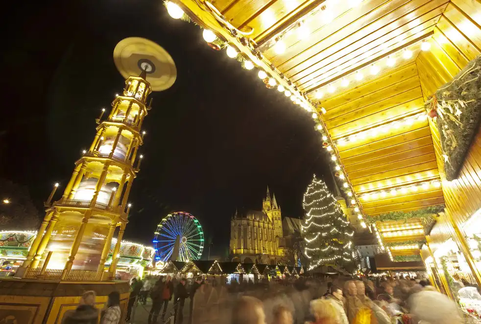 7. Более 200 стендов с традиционными тюрингскими поделками и сладостями и большое колесо обозрения на рождественской ярмарке перед собором святой Марии в Эрфурте, Германия. (AP / Jens Meyer)