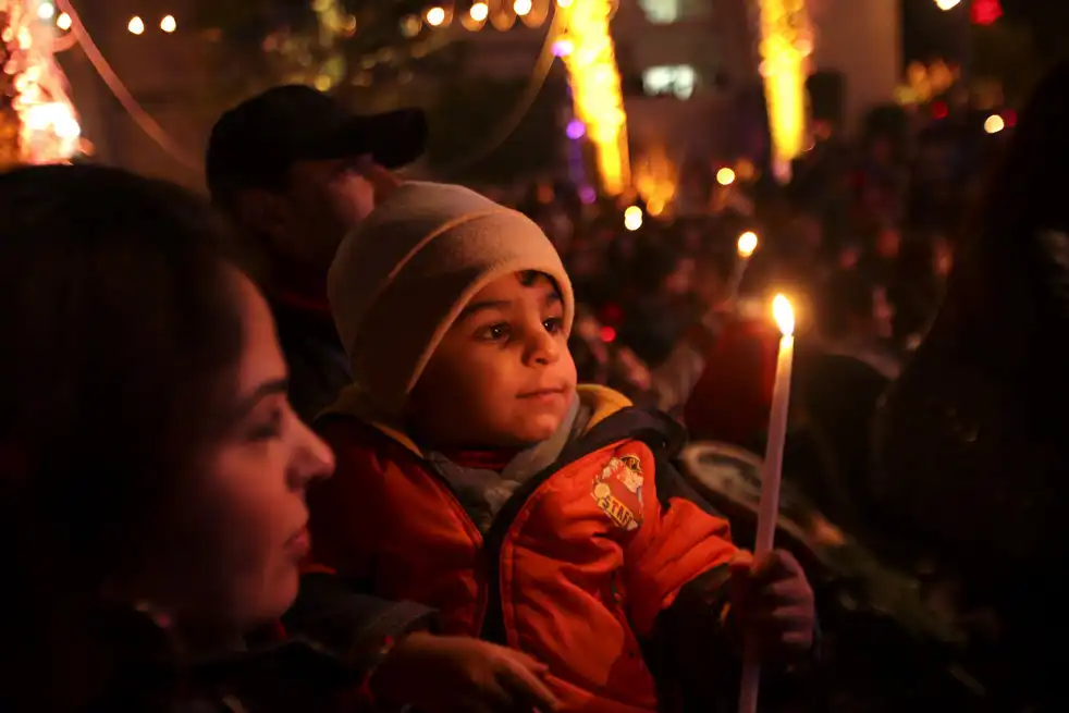 21. Палестинский мальчик с мамой на церемонии зажжения рождественской елки в Рамалле. (ZUMA24.com / Fadi Arouri)