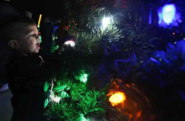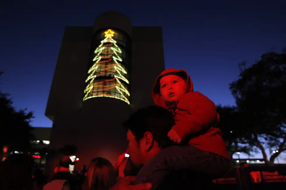 28. 20-месячный Эмиль Бэйкер-младший смотрит на праздничные гирлянды и огни на территории детской больницы в Корпус-Кристи, штат Техас. (Corpus Christi Caller-Times / Michael Zamora)