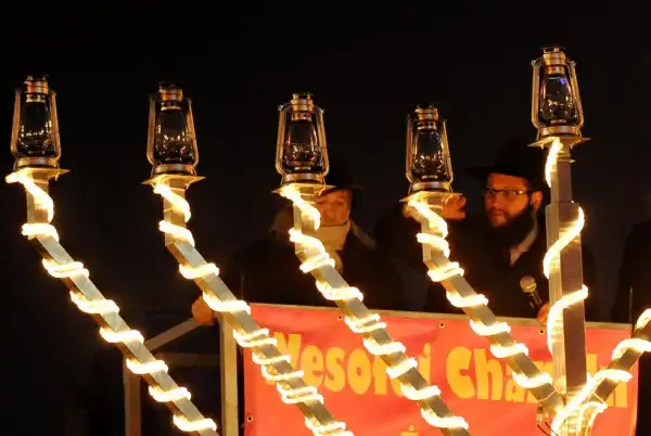 11. Раввин Шалом Бер Стэмблер (справа) зажигает свечи на большой меноре в центре Варшавы во время еврейской Хануки. (AP / Alik Keplicz)