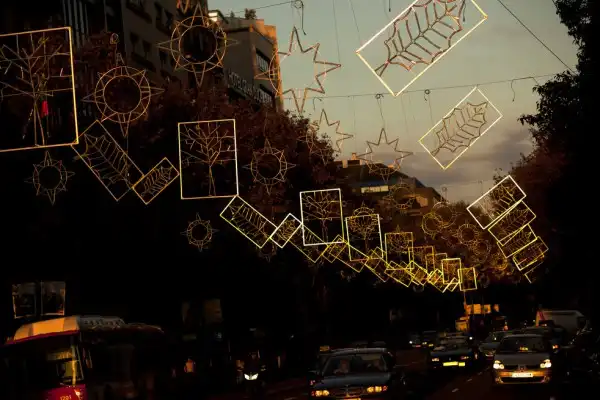 3. Солнце освещает рождественские украшения в Барселоне. Гирлянды и огни во многих городах Европы горят не так ярко - признак экономического не спокойствия. (AP / Emilio Morenatti)