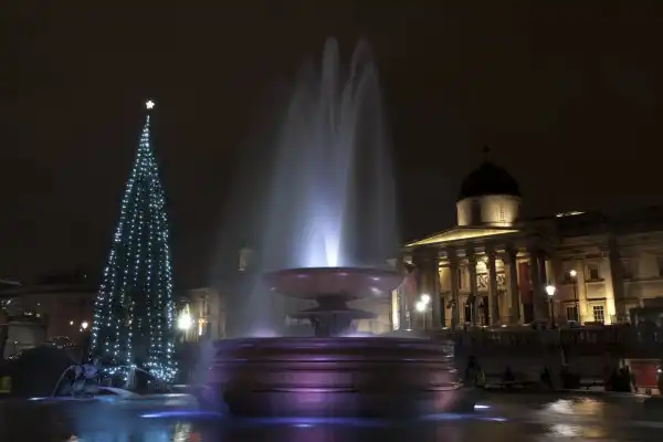 6. Норвежская елка с включенными огнями после ежегодной церемонии зажжения на Трафальгарской площади в Лондоне. Эта елка - традиционный рождественский подарок из Осло в знак благодарности британцам за поддержку норвежского народа во Второй мировой войне. (AP / Matt Dunham)