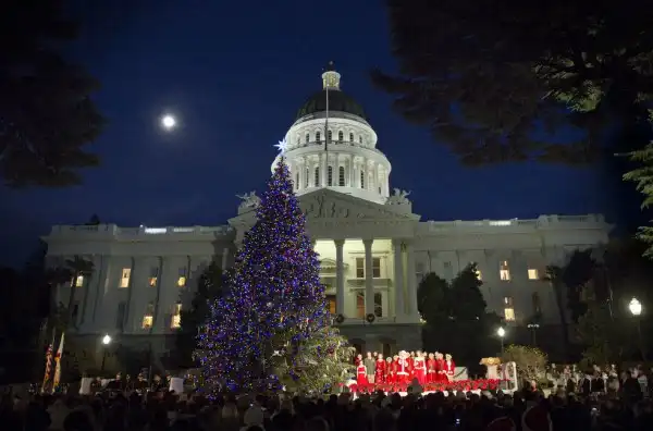 34. Оперный театр Вудленда исполняет песню «Белое Рождество», после того как губернатор Джерри Браун, его жена Энн Гаст Браун и 6-летний Микайла Джонс зажгли елку перед Капитолием в Сакраменто, штат Калифорния. Дерево украшено 900 игрушками, сделанными вручную умственно отсталыми детьми и взрослыми. (The Sacramento Bee / Paul Kitagaki Jr.)