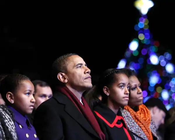 26. Президент США Барак Обама с женой Мишель и дочерьми Сашей и Малией на ежегодной церемонии зажжения елки в Вашингтоне. (AP / Haraz N. Ghanbari)