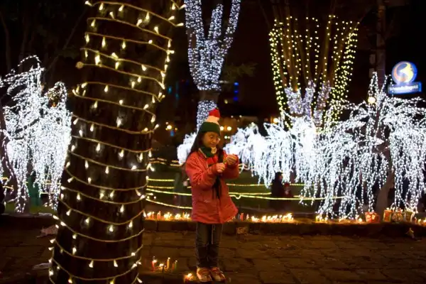 16. Девочка зажигает свечу в вечер свечей в Боготе, Колумбия. Колумбийцы традиционно зажигают свечи и фонарики накануне празднования непорочного зачатия Девы Марии, которое считается неофициальным началом рождественского сезона. (AP / William Fernando Martinez)