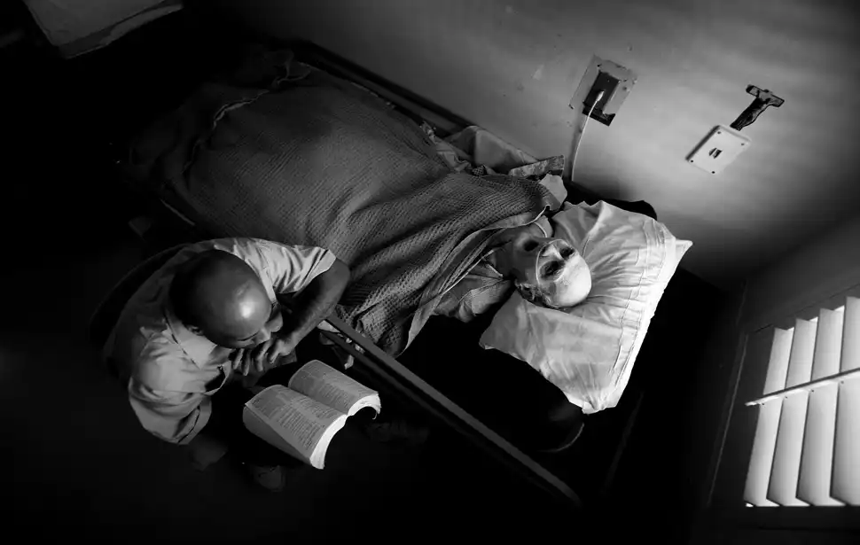 Заключенный Эндрю Шелтон (слева), читает Библию у постели умирающего Уильяма Меррита. Когда заключенному остается жить менее 72 часов, рядом с ним постоянно кто-то находится, чтобы тот не умирал в одиночестве.