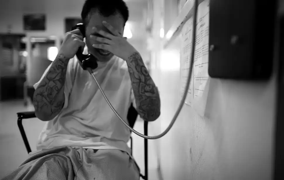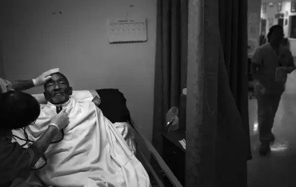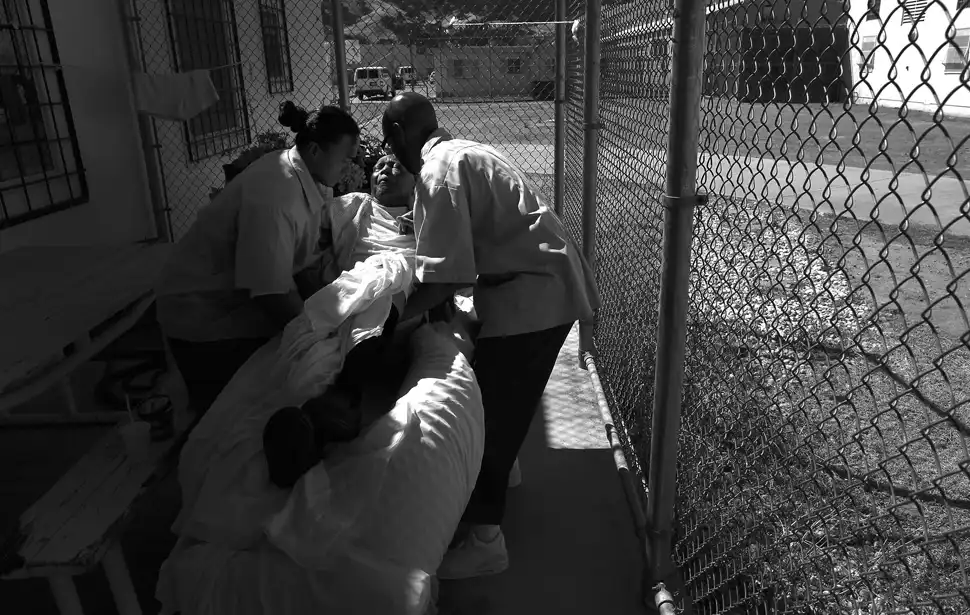 Хуан Морено дотрагивается до лба умирающего Уильяма Меррита. Тюремный хоспис открылся в 1991 году из-за эпидемии СПИДа, и обстановка его была спартанской: 17 коек в 7 камерах, расположенных вокруг одного медицинского поста.