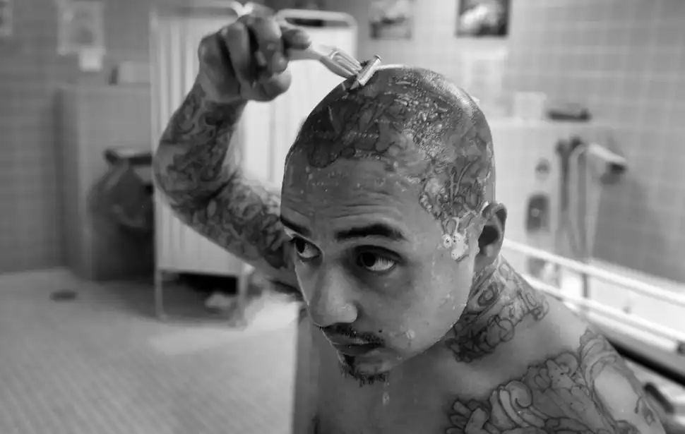 Фредди Гарсиа бреет голову перед свадьбой 6 мая 2011 года в хосписе тюрьмы Вакавилль в Калифорнии.