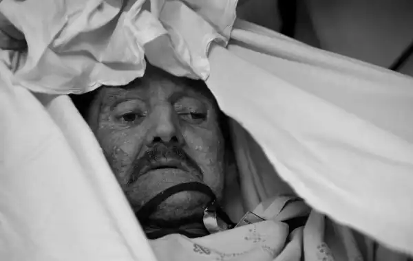 Рональда Брамлетта на простынях переносят из одной камеры хосписа в другую.