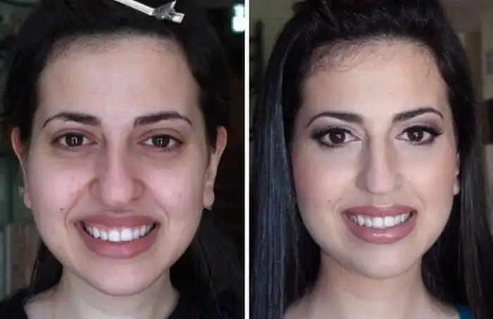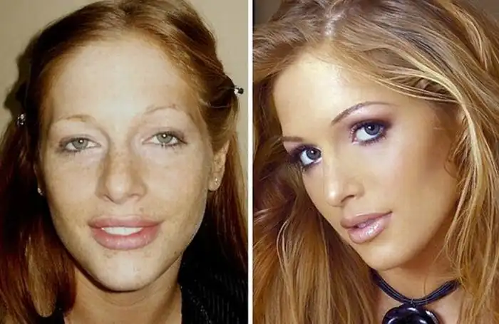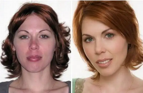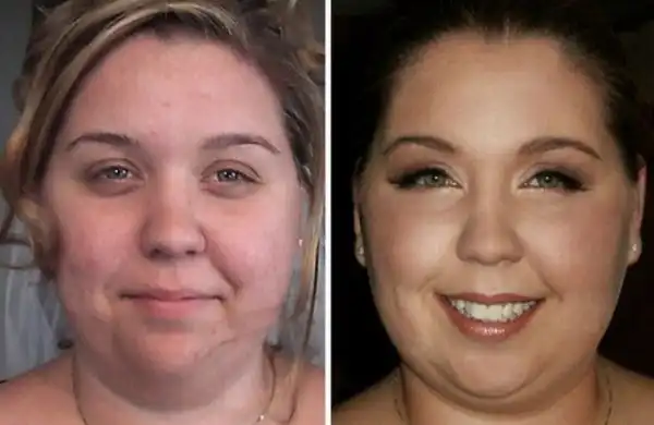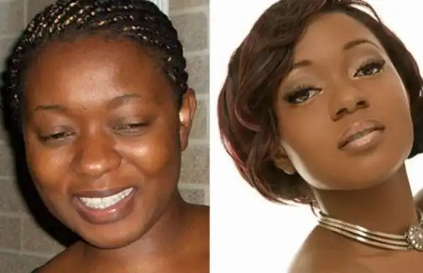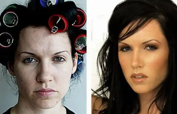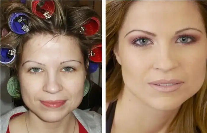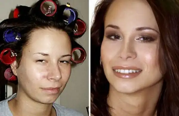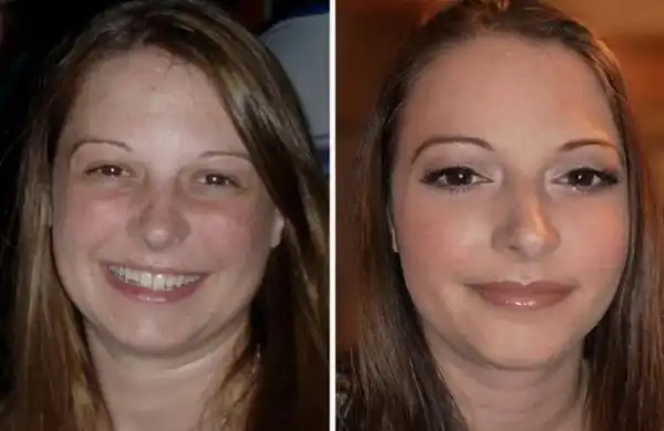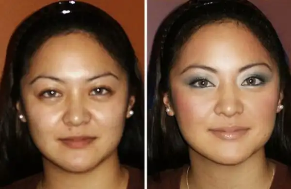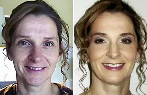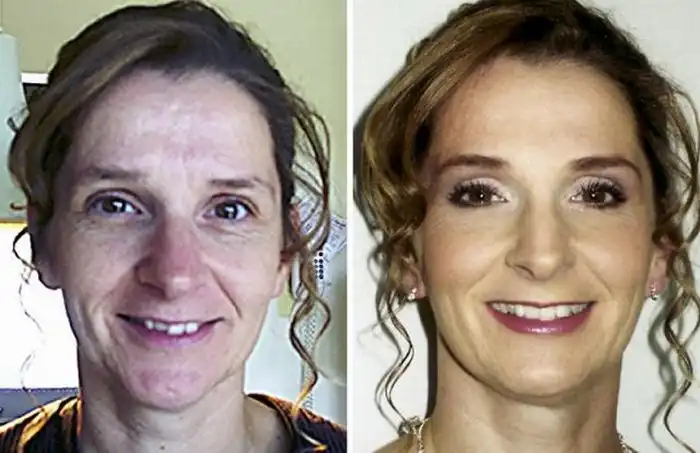 Фотографиях - "До", так же заметен криворукий фотограф, неправильная постановка света и говённый объектив.... Думаю что что с макияжем, что без него женщины выше, у одного и того же фотографа, получились бы примерно одинаково.
