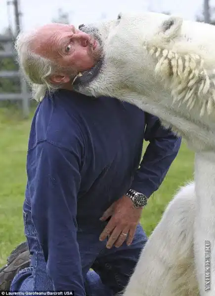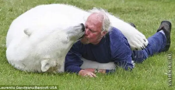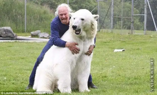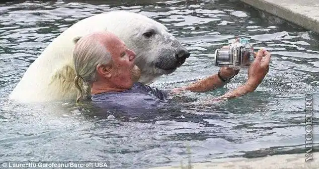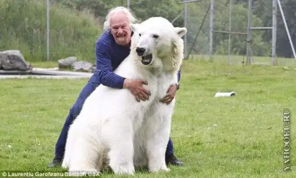 16-летнюю белую медведицу зовут Эйджи, дрессировщик носит скромное имя Марк.