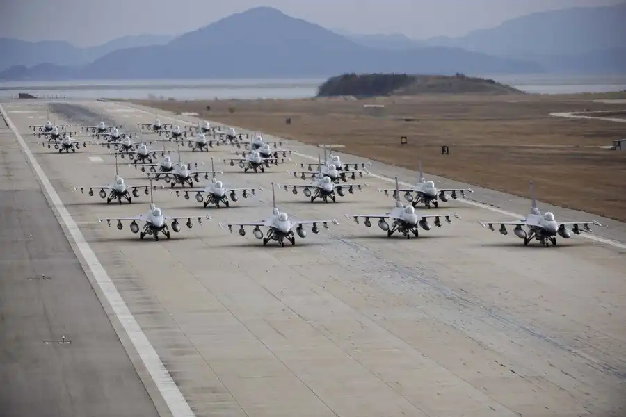 8. Истребители ВВС США F-16 Fighting Falcon во время тренировок 2 декабря 2011 года, на авиабазе в Kunsan, Южная Корея. Упражнения были призваны продемонстрировать возможности авиаподготовки для военных миссий.