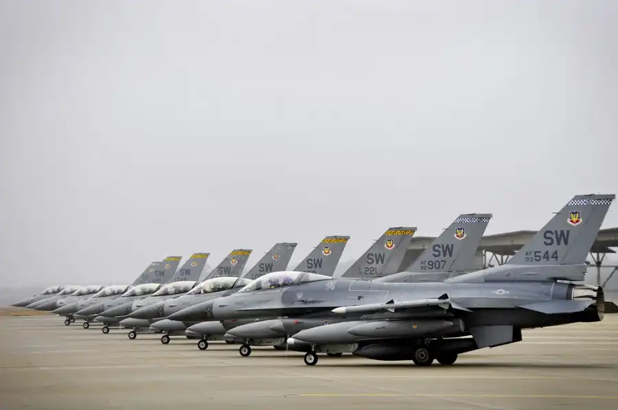 22. Девять истребителей ВВС США F-16 Fighting Falcon перед взлетом 10 января 2012 года на военной базе Shaw Air Force Base, штат Южная Каролина.