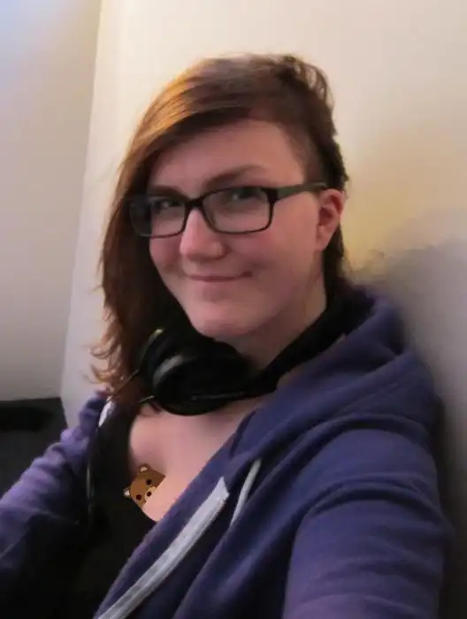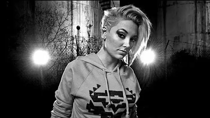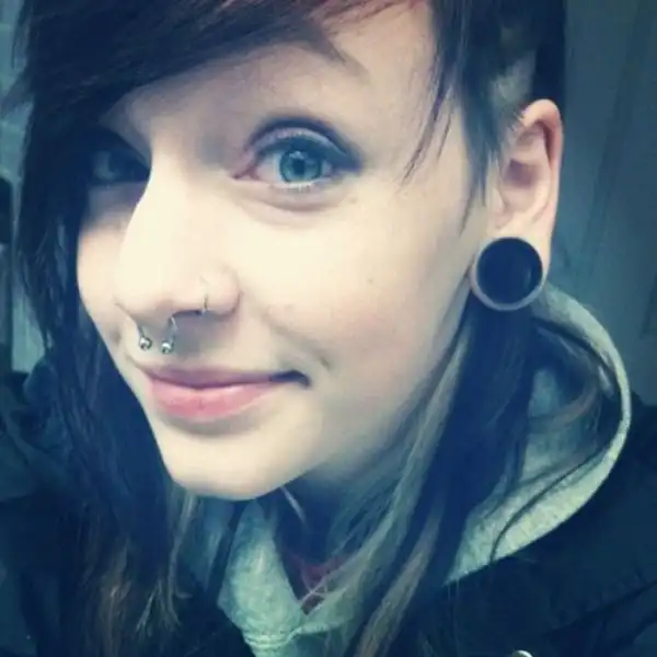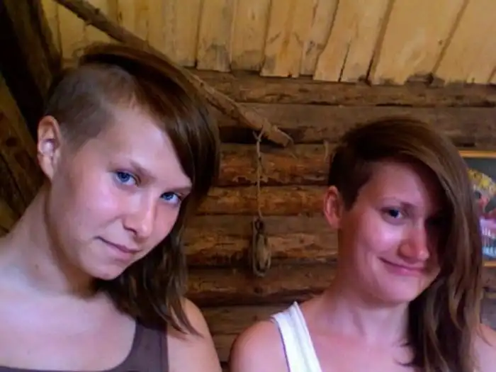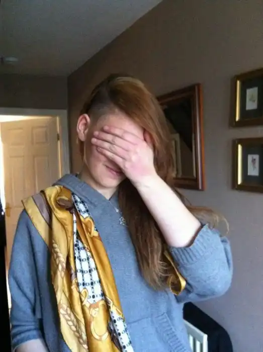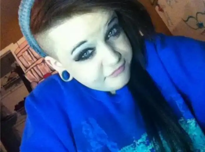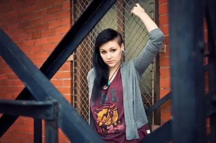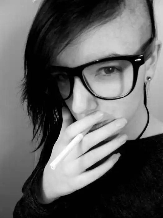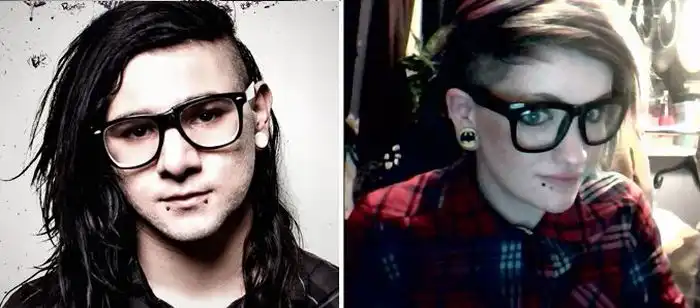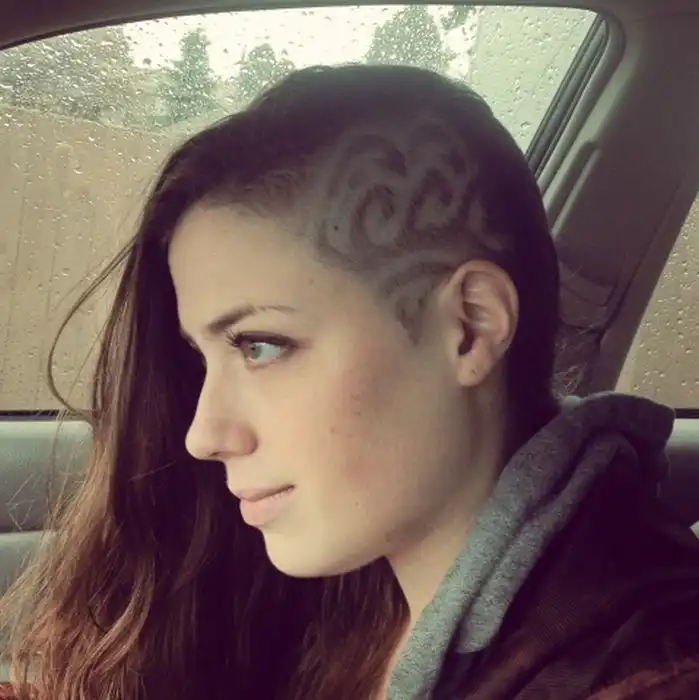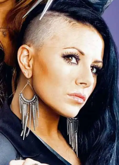 У него длинные волосы, зачесанные на бок, а со стороны пробора выбрита височная область.