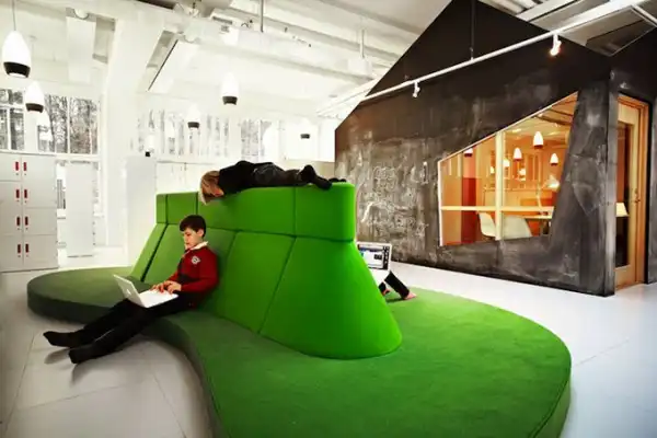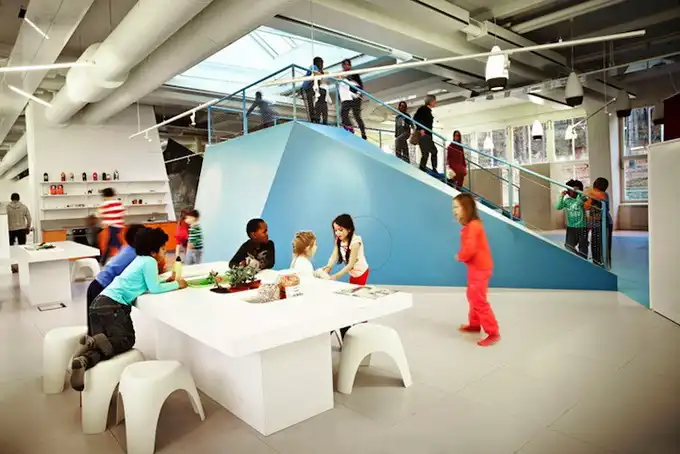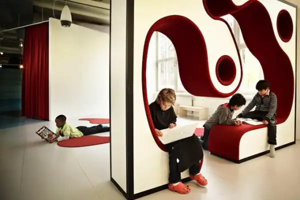 В свете этого команда архитекторов Bosch Rosan создала нетрадиционное пространство, где классная комната упразднена как таковая. Вместо этого студенты отдыхают на неоновых креслах, причудливых скамейках ар-деко, или собираются вокруг гигантского синего амфитеатра, который напоминает айсберг, возвышающийся посередине комнаты.