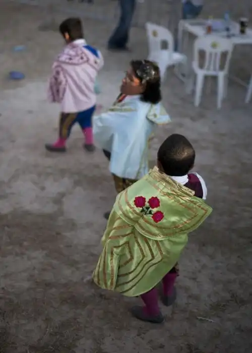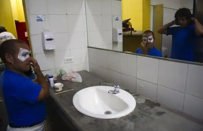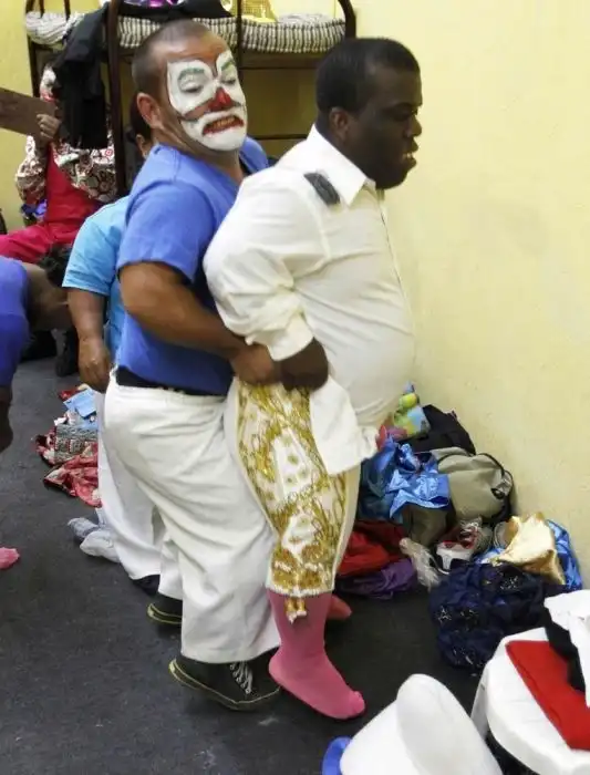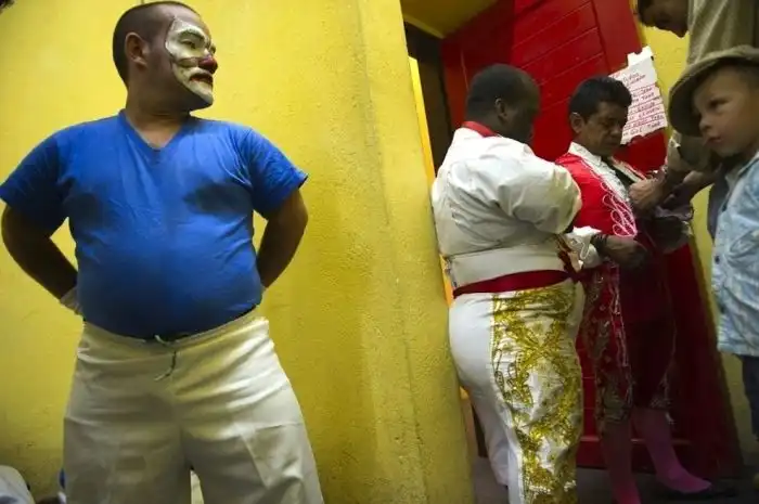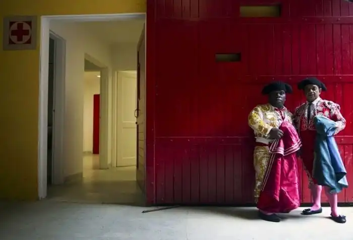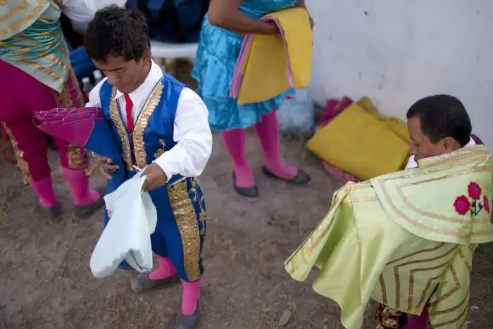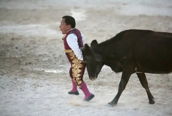 Карлики-тореадоры борются с маленькими быками на радость публике.