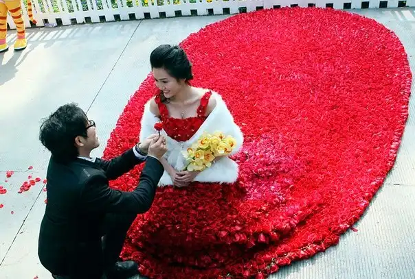 Китайский дизайнер Ксяо Фан весьма оригинально предложил своей возлюбленной руку и сердце – он изготовил для нее платье из 9999 роз. Девушка, разумеется, не смогла устоять и ответила согласием.