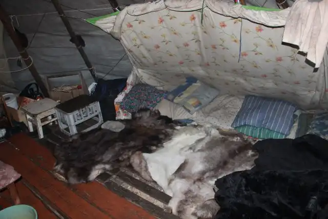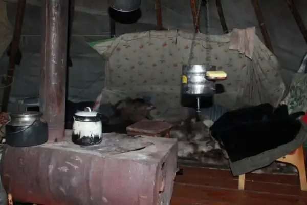 5. В центре чума находится печь, которая служит источником тепла и приспособлена для приготовления пищи. Тепло от печи поднимается вверх и не дает осадкам проникать в чум: они испаряются от большой температуры. Возле дымоходной трубы развешены оленьи шкуры для сушки и последующего изготовления кожи для бубна.