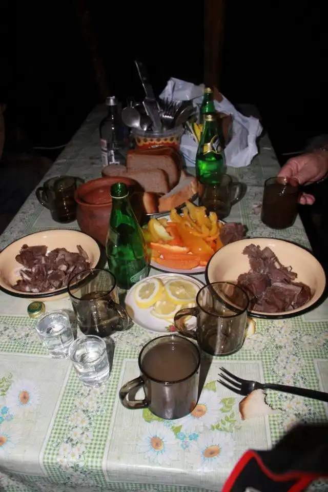 8. С собой привезли овощи, фрукты, оленина была от хозяев чума. Шурпу пили из стаканов, мясо обязательно есть руками, если вошли в чум то соблюдайте традиции-говорит Шаман.