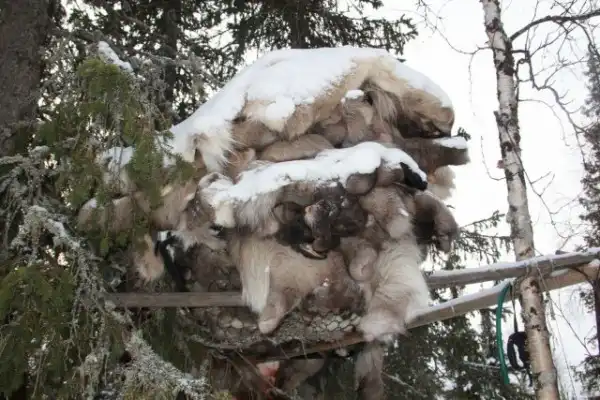 13. На улице есть специальное место для хранения оленьих шкур. По необходимости их отправляют в чум на сушку.