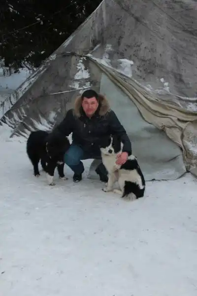 3. Подъехав к чуму нам сказали что шаман занят. На входе в чум преданно ожидает хозяина его лайка.