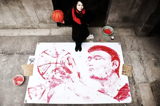 Портрет китайского баскетболиста Яо Миня, самого высокого игрока NBA (229 см), нарисован баскетбольным мячом.
