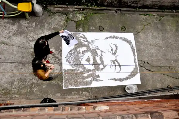 Портрет современного художника из Китая Вейвея (Weiwei), который в 2010 году в Лондоне представил инсталляцию из 100 000 000 фарфоровых семян подсолнечника, ровным слоем рассыпанных по полу. Для изготовления такого количества семян было задействовано 1600 китайских рабочих.