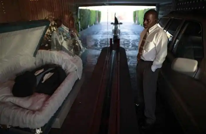 Руководствуясь этим, он открыл "Дома прощания", куда он выставляет тело усопшего,