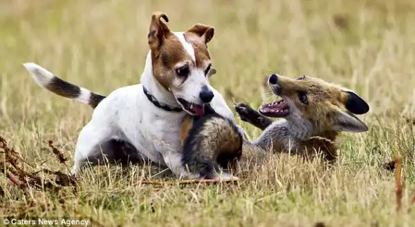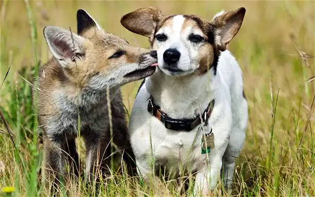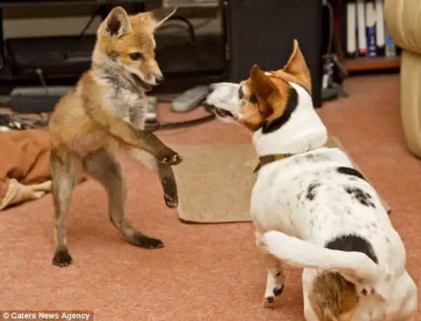 Осиротевшего лисенка подобрал фотограф Brian Bevan (предварительно сбив его мамашу машиной). Принес домой и его на воспитание немедленно оформил его терьер, Sadie. Воспитанный собакой, лисенок потерял, а может и не приобрел навыков и замашек, присущих диким зверям, и сейчас 8-ми месячная лиса всегда бегает рядом со старшим товарищем - терьером.