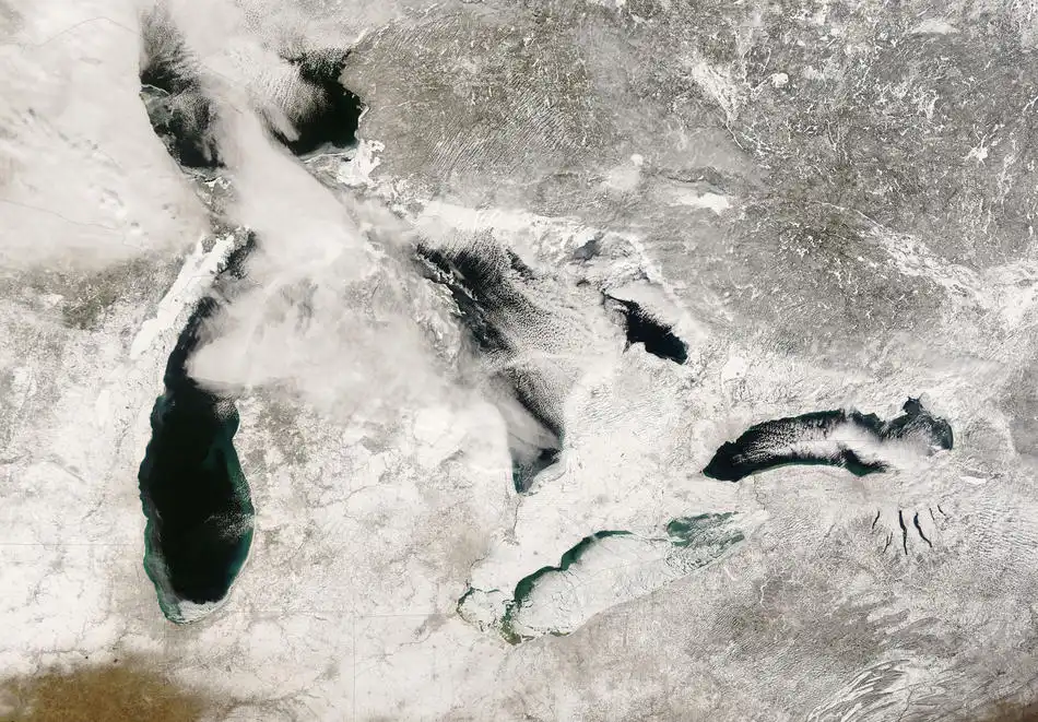 36. Великие озера, Северная Америка, 16 февраля 2008 года. (MODIS Rapid Response Team at NASA GSFC)