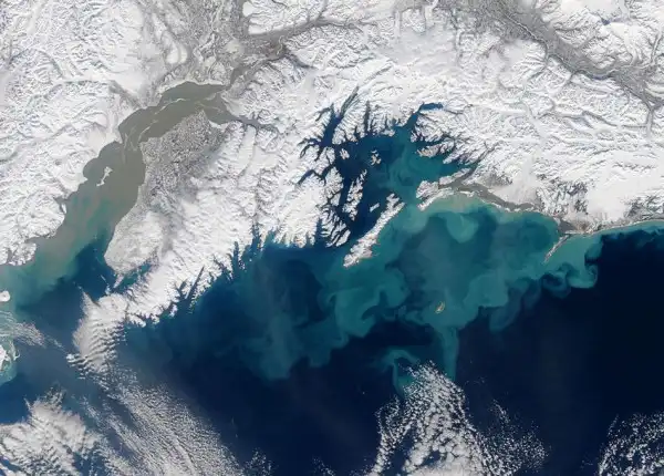 4. Кружащийся осадок в заливе. Этого не видно из космоса, но такие вихри – признак того, что океан неспокоен. Сильный ветер и волны заставляют осадок подниматься к поверхности. Мелкий осадок – перемолотые ледниками в порошок скалы – стекает в океан вместе с водой рек. (NASA image by Norman Kuring, MODIS Ocean Color Team)