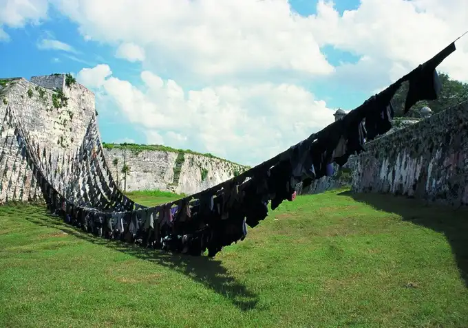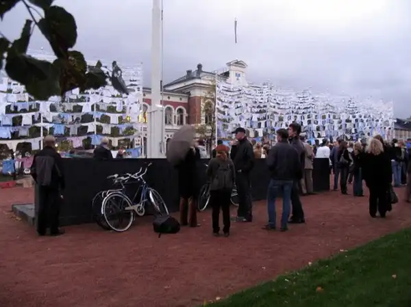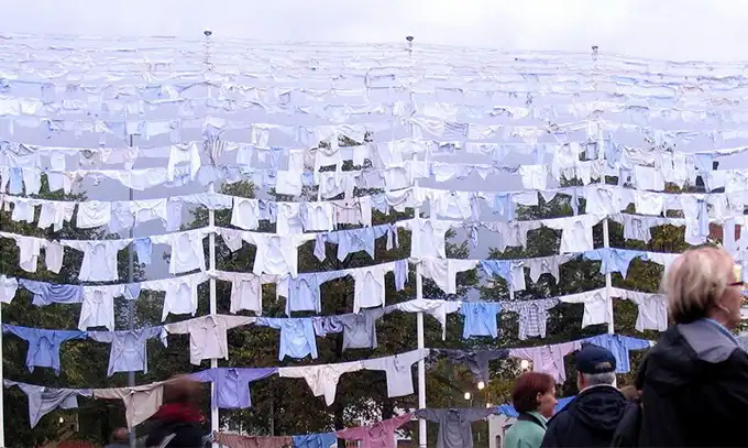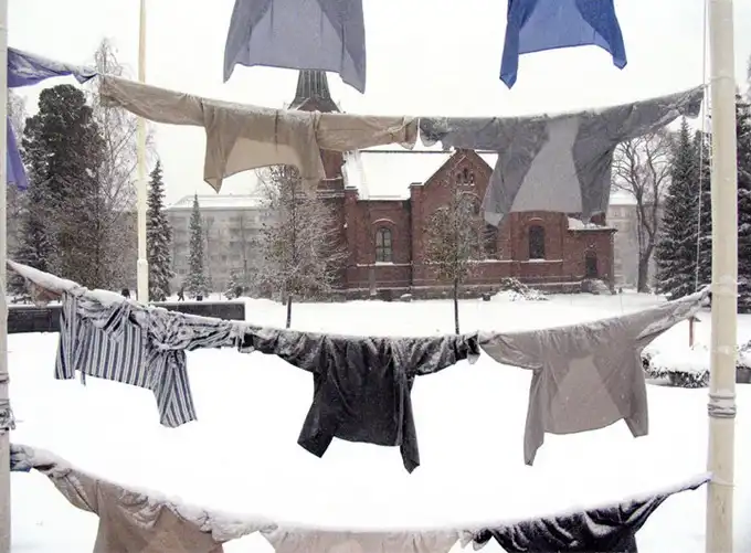 Финская художница Каарина Кэйкконен (Kaarina Kaikkonen) создает инсталляции из одежды секонд-хэнд. Художница развешивает одежду на веревке, словно после прачечной. Кто бы подумал, что веревки для белья могут создавать такой интригующий арт?