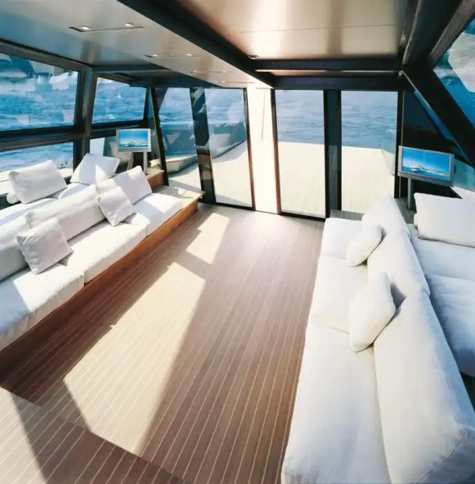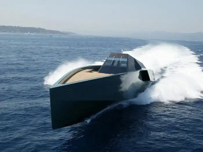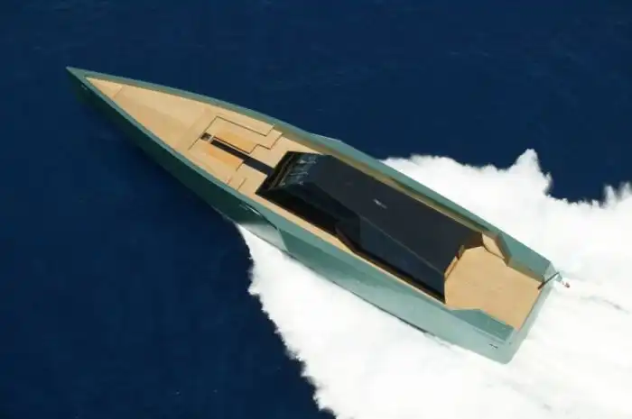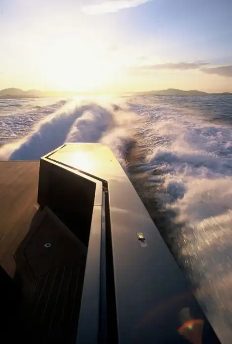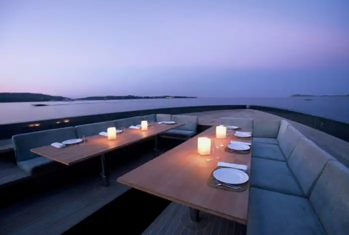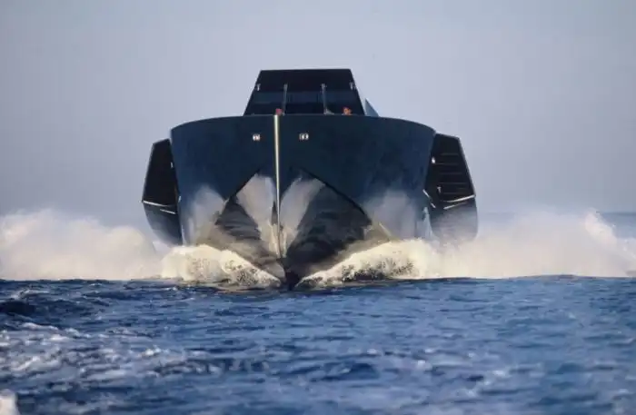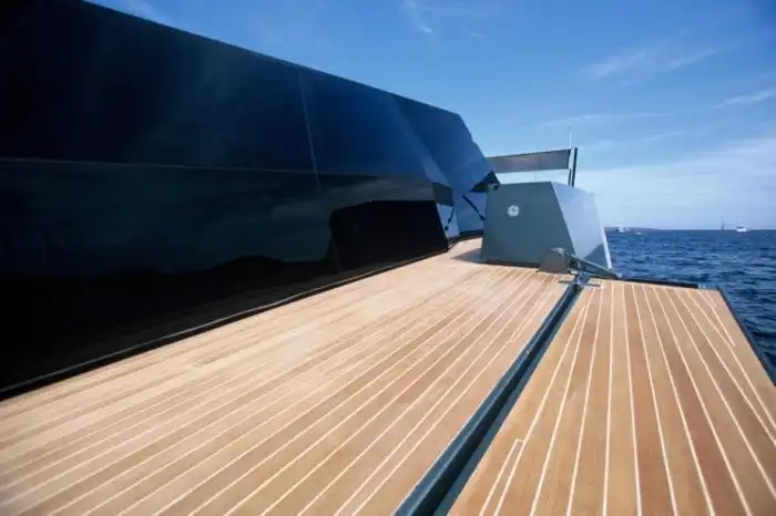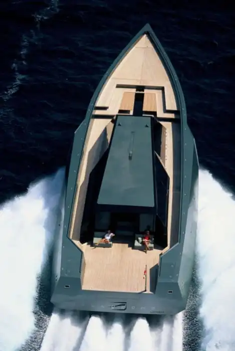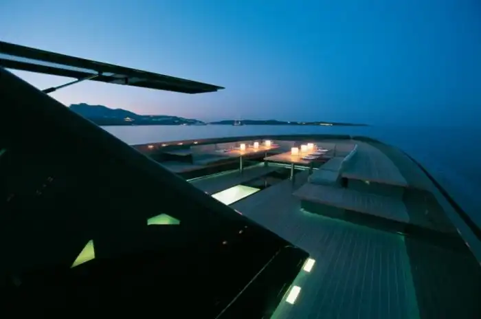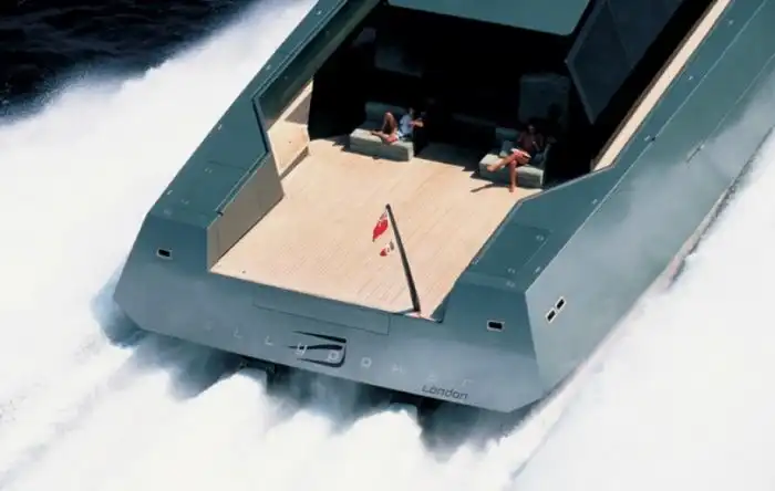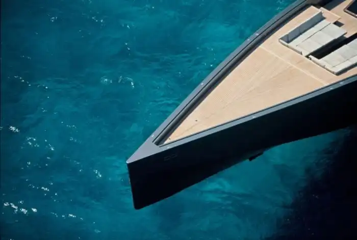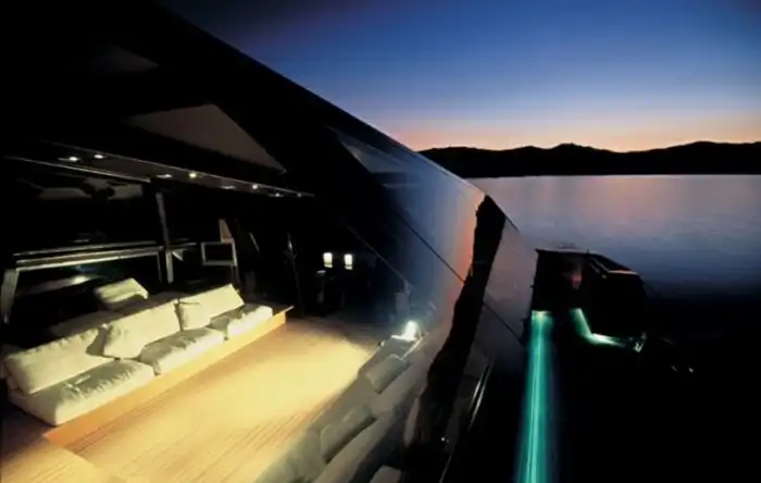 Дизайн яхты сразу привлекает к себе внимание своим футуристическим видом.