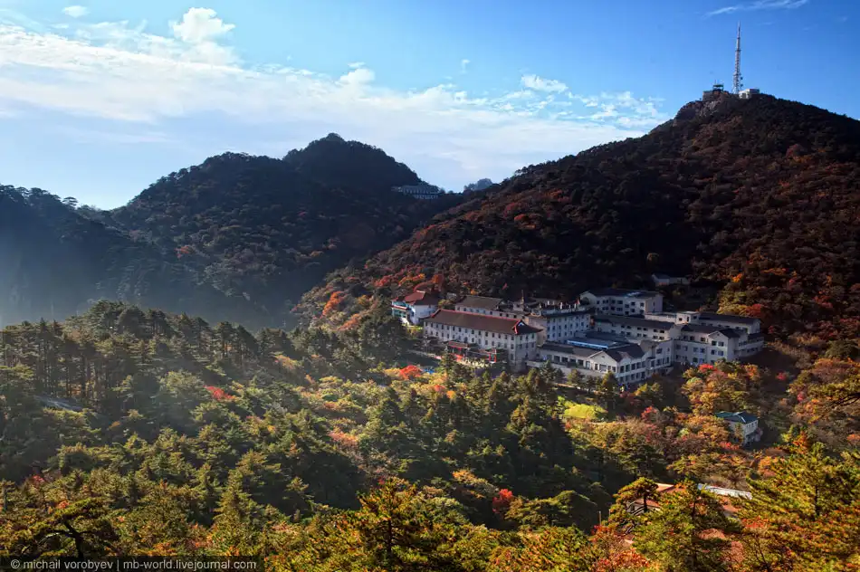 Вечером мы отправились встречать закат на пик Bright peak (Guang Ming Ding), который является третьим по высоте в Хуаншане (1860 м). Он представляет собой плоскую вершину, где расположены метеостанция, телевышка и отель.