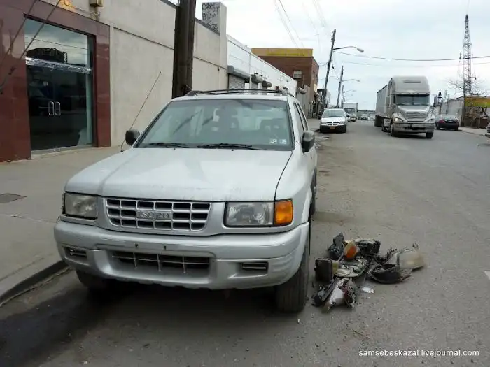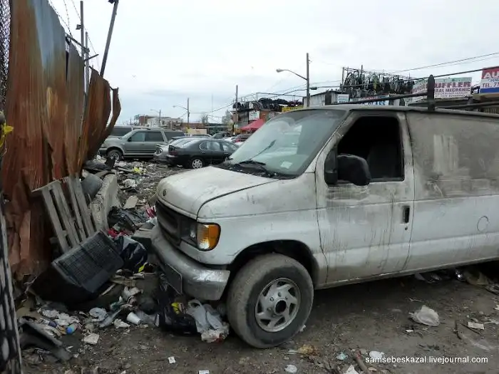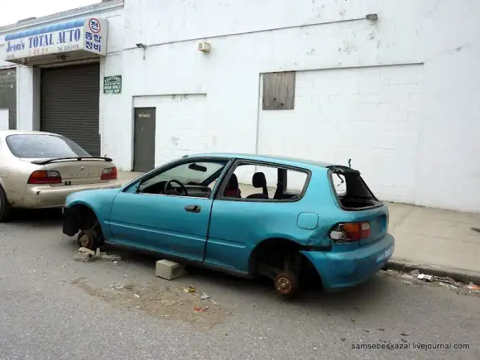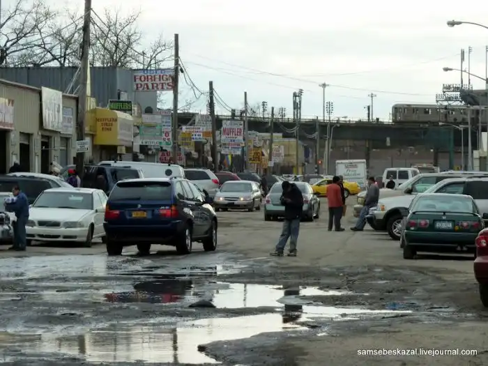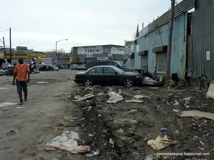 На обочинах плохих дорог стоят брошенные и разбитые автомобили, а на тротуаре кучи мусора.