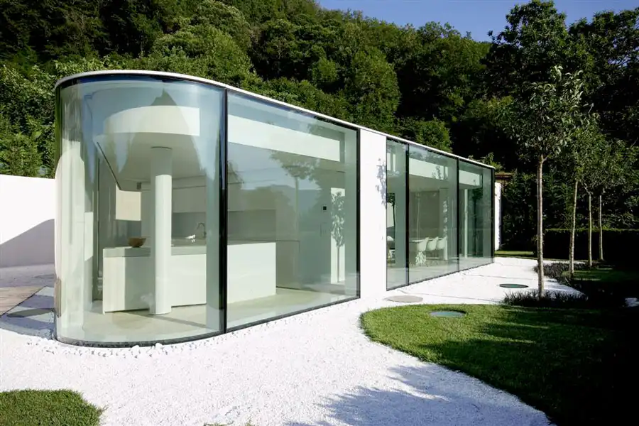 Стеклянный павильон с закругленными краями возведен поверх подземного блока. В павильоне представлены гостиная, столовая, кухня и кладовая, в то время, как три спальни и ванные комнаты вместе с гаражом предусмотрены на нижнем уровне. Из каждого из блоков имеется выход во двор, причем к ним примыкают два различных сада, не связанных друг с другом.