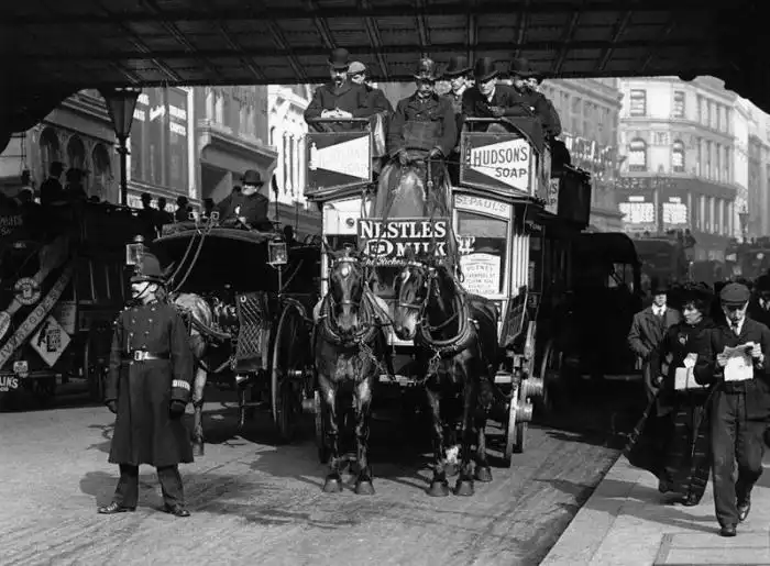 52. Конка под железнодорожным мостом в Ладжигейт Хилл, Лондон. 1902 год.