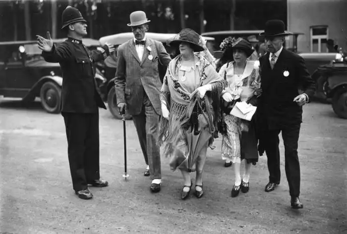 9. Полицейский помогает перейти дорогу зрителям скачек лондонском районе Гудвуд, 27 июля 1926 года.