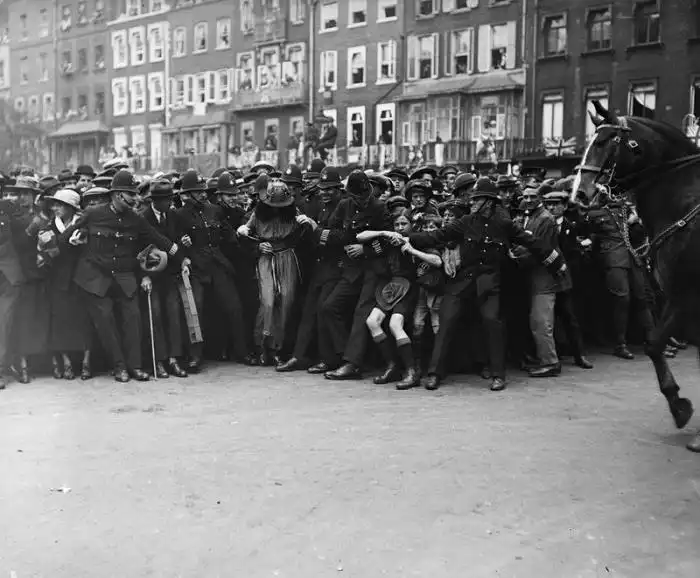 19. Полицейские сдерживают зрителей на параде в Лондоне. Июль 1919 года.