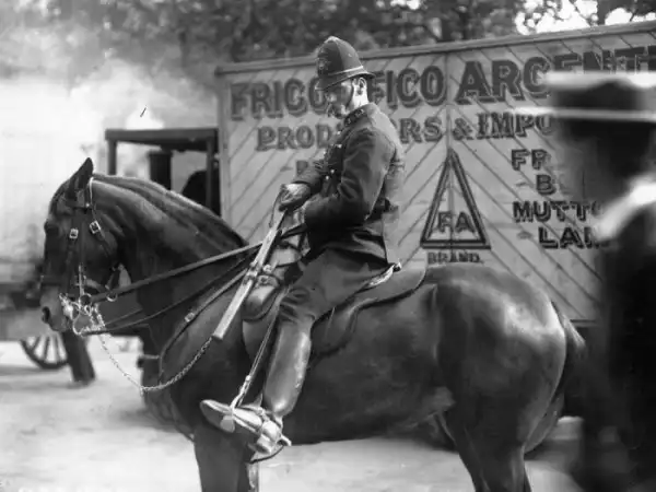 6. Конный полицейский возле мясного рынка Смитфилд во время забастовки транспортных рабочих. 1912 год.