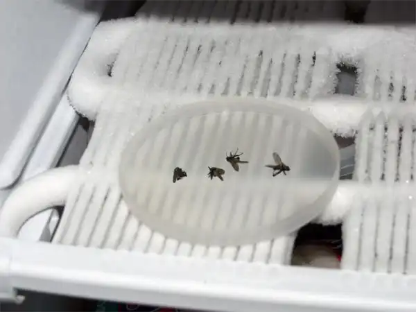балбесик =) Мух не надо замораживать, а только охладить - что б они уснули как в зиму по осени засыпают, и с осами таже беда!!!! ничто живое не переживат заморозку =) Хоть с голубями не додумался проэксперементировать =))))))