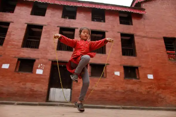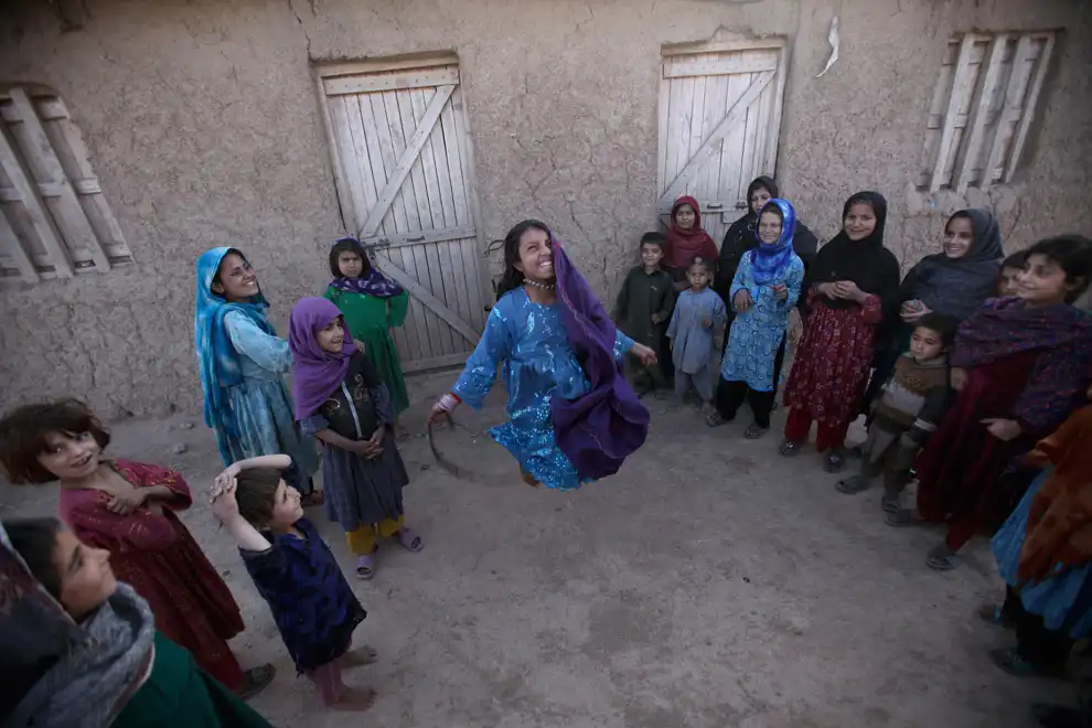 Афганская девочка прыгает через веревку, играя вместе с другими детьми в районе трущоб на окраине Исламабада, Пакистан.