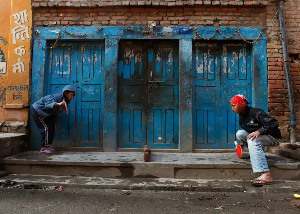Дети играют в настольный теннис возле закрытого магазина в Бхактапуре на окраине Катманду, Непал.