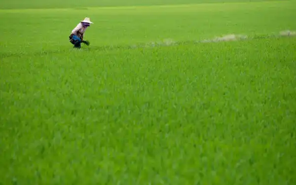 Фермер работает в рисовом поле на окраине Куала-Лумпура, Малайзия.